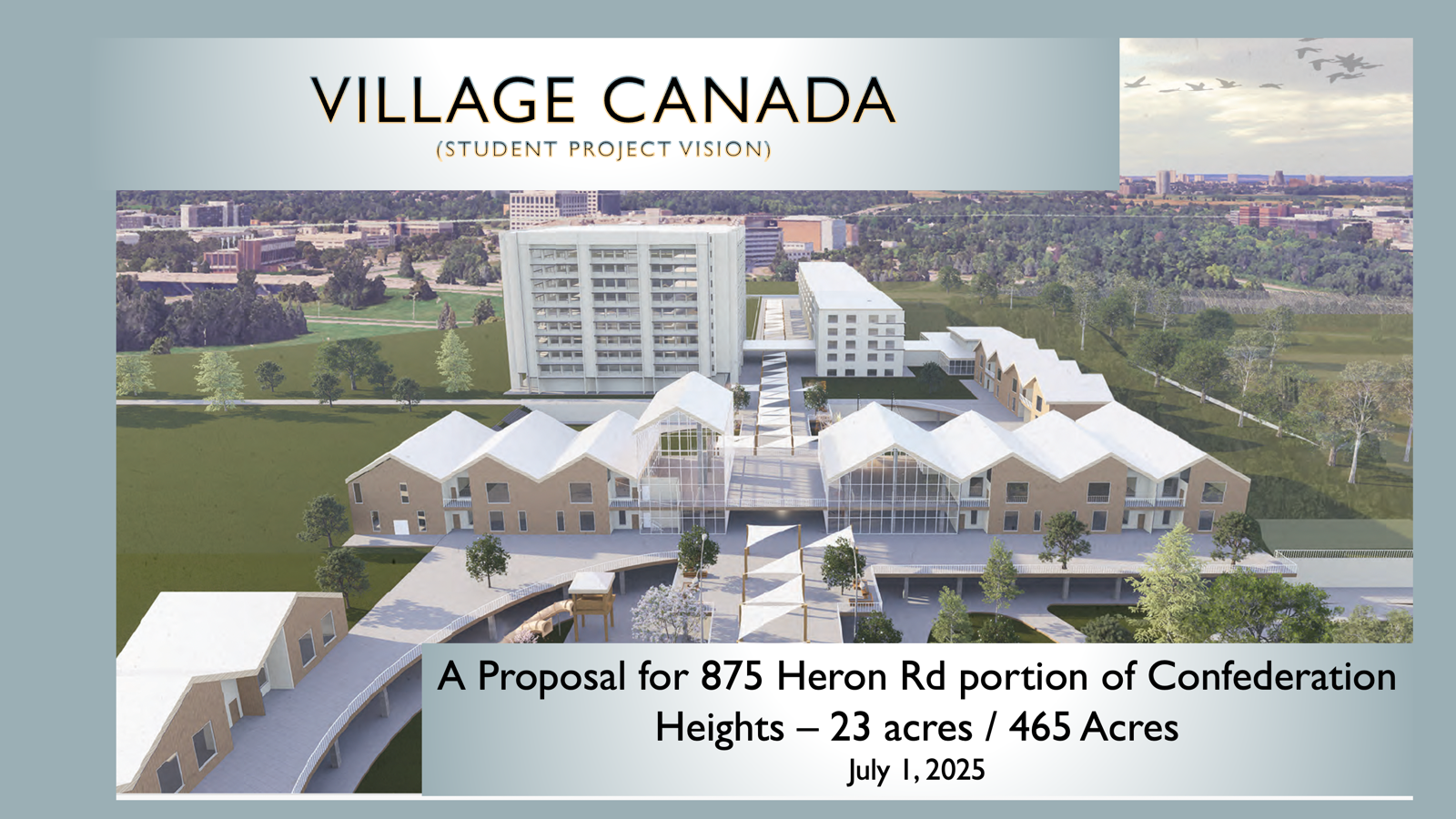 Over the fall of 2025, the Village Canada Consortium met with Canada Lands Company (CLC), the federal organization responsible for development of federal surplus property at Confederation Heights. We consulted with CLC in the past and were now able to present our vision in greater detail. They agree that our vision aligns with theirs.